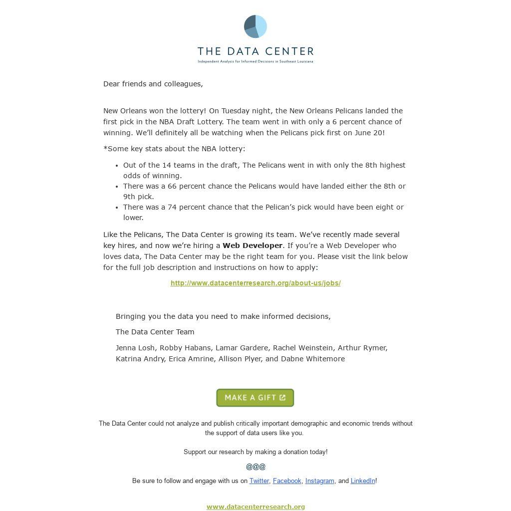 Like the Pelicans, The Data Center is growing its team. We’ve recently made several key hires, and now we’re hiring a Web Developer. If you’re a Web Developer who loves data, The Data Center may be the right team for you. Please visit the link below for the full job description and instructions on how to apply: