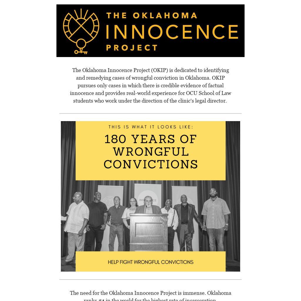 The Oklahoma Innocence Project (OKIP) is dedicated to identifying and remedying cases of wrongful conviction in Oklahoma. OKIP pursues only cases in which there is credible evidence of factual innocence and provides real-world experience for OCU School of Law students who work under the direction of the clinic's legal director.