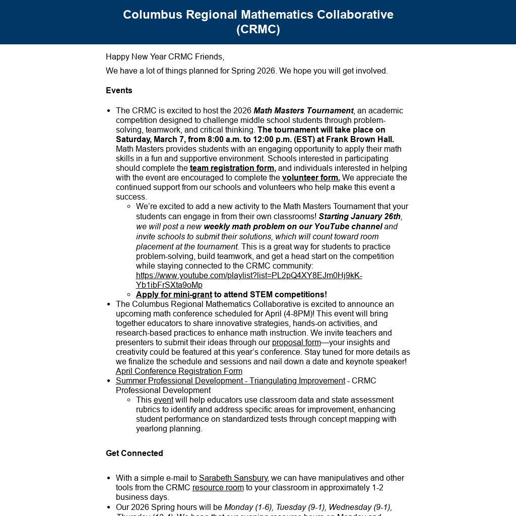 The Columbus Regional Mathematics Collaborative is excited to announce an upcoming math conference scheduled for April (4-8PM)! This event will bring together educators to share innovative strategies, hands-on activities, and research-based practices to enhance math instruction. We invite teachers and presenters to submit their ideas through our proposal form—your insights and creativity could be featured at this year’s conference. Stay tuned for more details as we finalize the schedule and sessions and nail down a date and keynote speaker! April Conference Registration Form