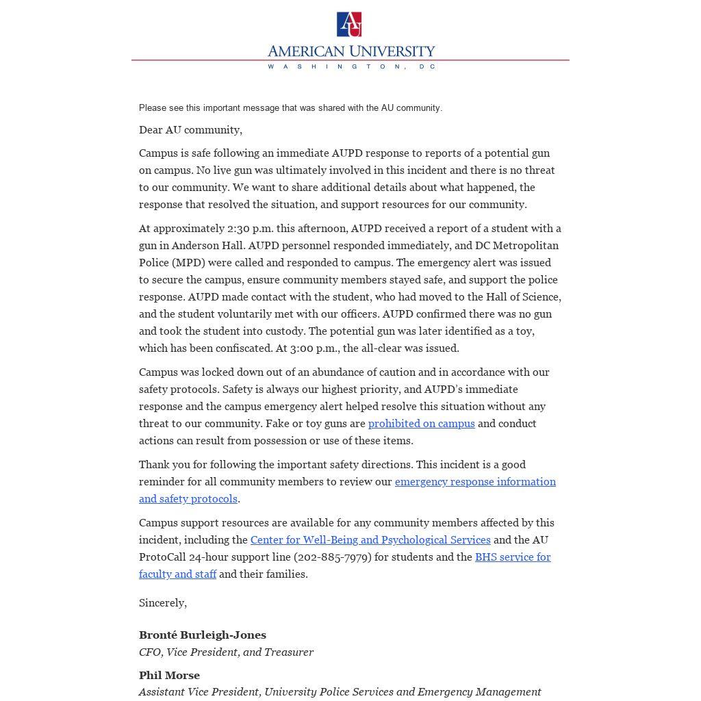 Campus is safe following an immediate AUPD response to reports of a potential gun on campus. No live gun was ultimately involved in this incident and there is no threat to our community. We want to share additional details about what happened, the response that resolved the situation, and support resources for our community.