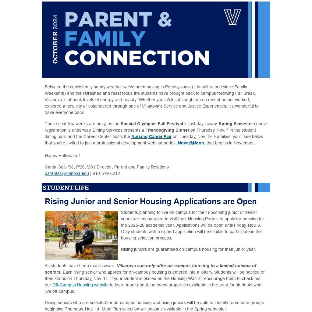 As students have been made aware, Villanova can only offer on-campus housing to a limited number of seniors. Each rising senior who applies for on-campus housing is entered into a lottery. Students will be notified of their status on Thursday, Nov. 14. If your student is placed on the Housing Waitlist, encourage them to check out our Off-Campus Housing website to learn more about the many properties available in the area for students who live off-campus.
