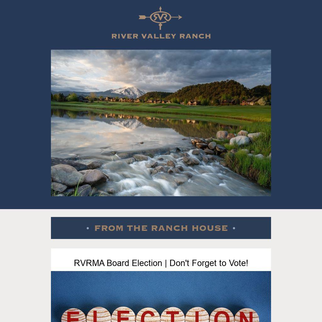 Ballots for the RVRMA Board Election were sent out on Friday, June 23, via email - as allowed by Colorado Law and RVR By-Laws. The voting deadline is today Friday, July 14. Don't forget to vote! Ballots will be counted on Monday, July 17 and election results will be published the same day.