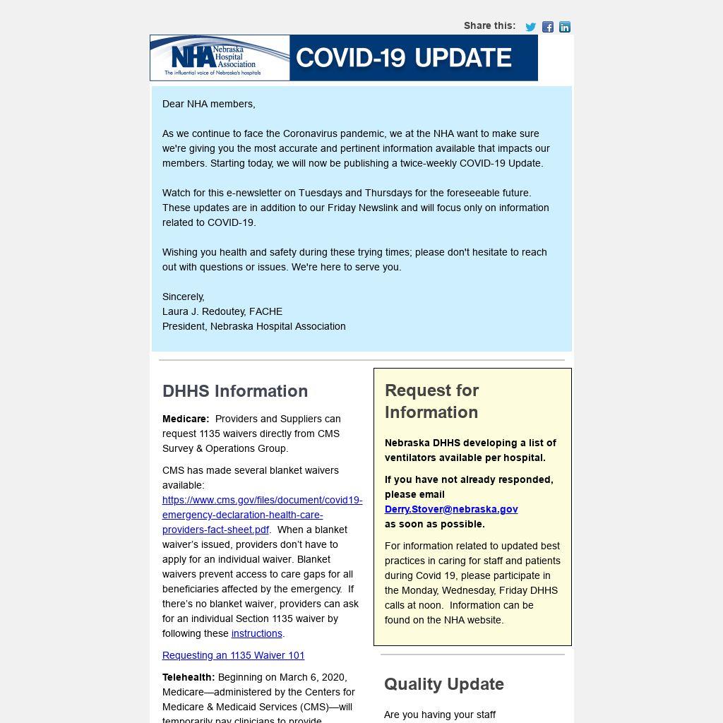 As we continue to face the Coronavirus pandemic, we at the NHA want to make sure we're giving you the most accurate and pertinent information available that impacts our members. Starting today, we will now be publishing a twice-weekly COVID-19 Update.