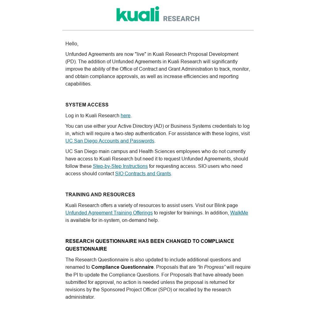 UC San Diego main campus and Health Sciences employees who do not currently have access to Kuali Research but need it to request Unfunded Agreements, should follow these Step-by-Step Instructions for requesting access. SIO users who need access should contact SIO Contracts and Grants.