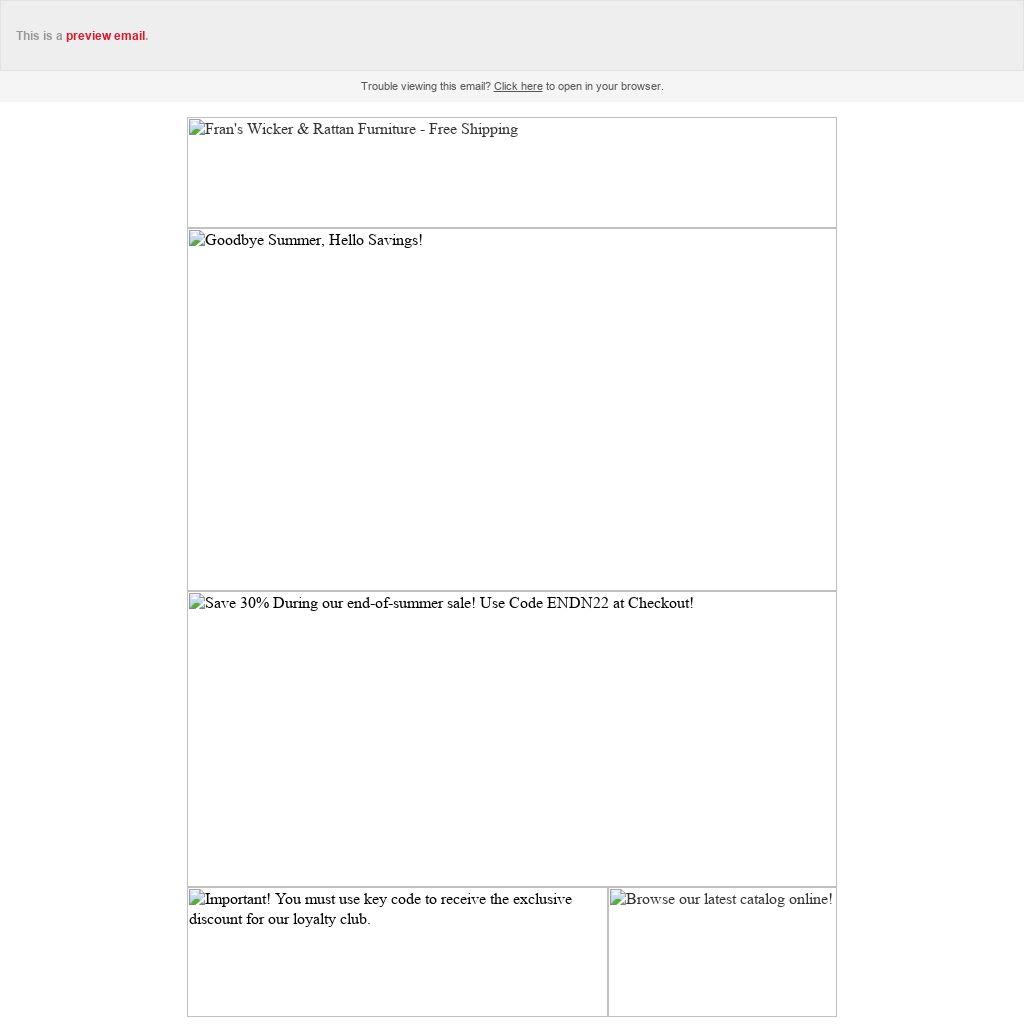 | This offer does not apply to prior purchases and cannot be combined with any other coupons, advertisements, or offers. Be sure to visit our website www.franswicker.com to view our complete assortment of wicker and rattan. We enjoy bringing you updates on new products and special offers and would love to continue to do so. If you would prefer to unsubscribe to this newsletter, please click on the manage profile link below. |