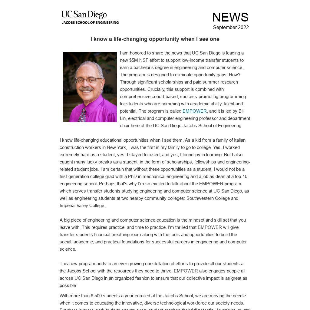 I am honored to share the news that UC San Diego is leading a new $5M NSF effort to support low-income transfer students to earn a bachelor’s degree in engineering and computer science. The program is designed to eliminate opportunity gaps. How? Through significant scholarships and paid summer research opportunities. Crucially, this support is combined with comprehensive cohort-based, success-promoting programming for students who are brimming with academic ability, talent and potential. The program is called EMPOWER, and it is led by Bill Lin, electrical and computer engineering professor and department chair here at the UC San Diego Jacobs School of Engineering.