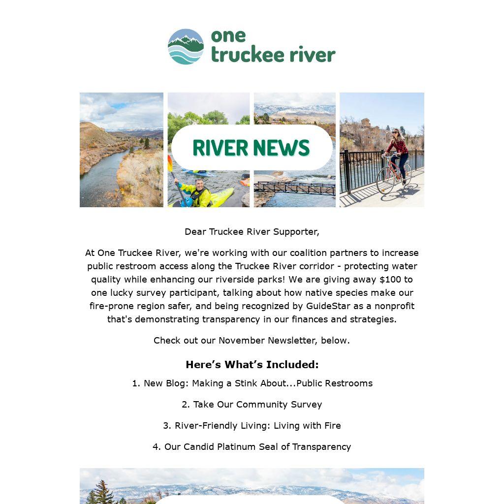 At One Truckee River, we're working with our coalition partners to increase public restroom access along the Truckee River corridor - protecting water quality while enhancing our riverside parks! We are giving away $100 to one lucky survey participant, talking about how native species make our fire-prone region safer, and being recognized by GuideStar as a nonprofit that's demonstrating transparency in our finances and strategies.