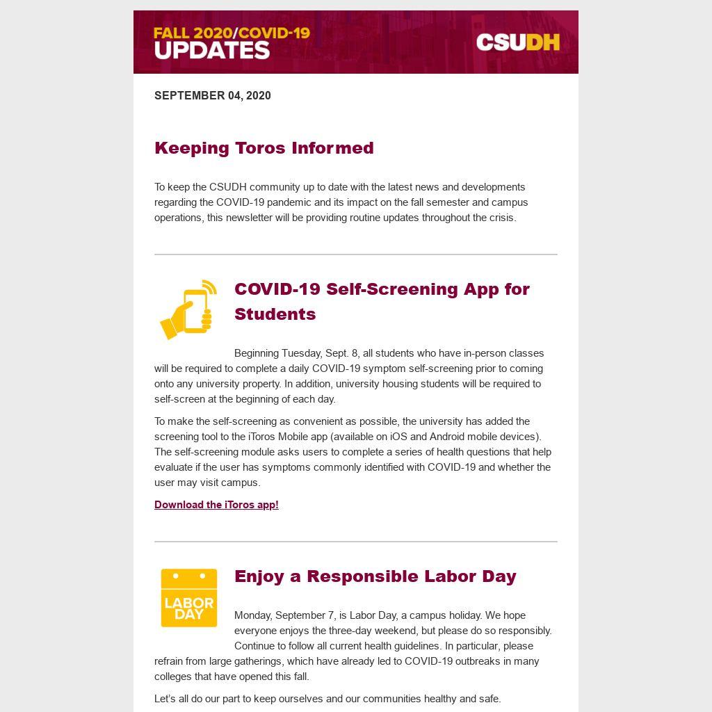 Monday, September 7, is Labor Day, a campus holiday. We hope everyone enjoys the three-day weekend, but please do so responsibly. Continue to follow all current health guidelines. In particular, please refrain from large gatherings, which have already led to COVID-19 outbreaks in many colleges that have opened this fall.