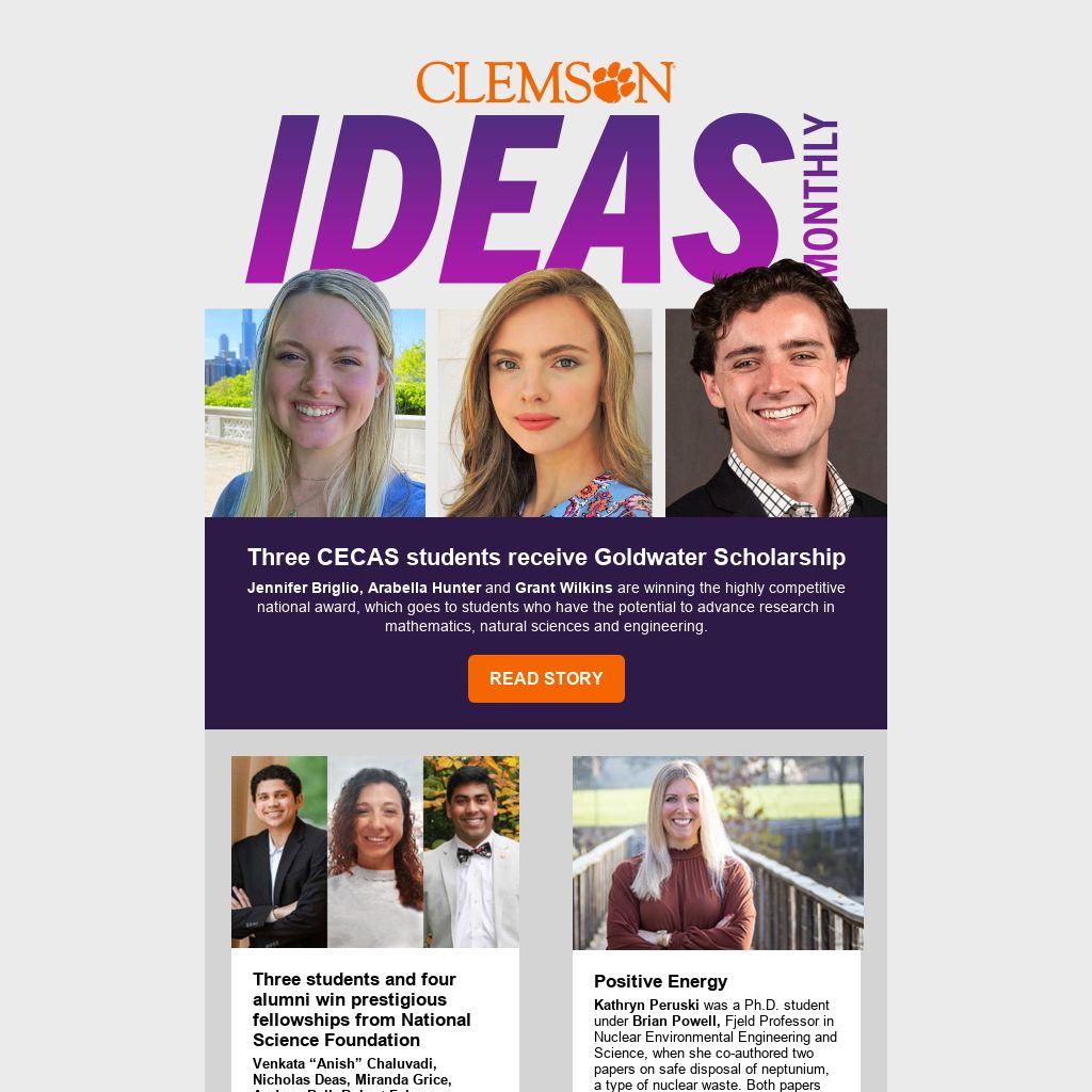 IDEAS Monthly is published by the PROMO Office in Clemson University’s College of Engineering, Computing and Applied Sciences. Contact the team with feedback or story suggestions.