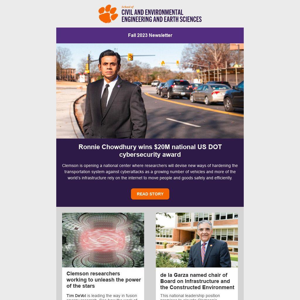 The School of Civil and Environmental Engineering & Earth Sciences Newsletter is published by the School and the PROMO Office in Clemson University’s College of Engineering, Computing and Applied Sciences.