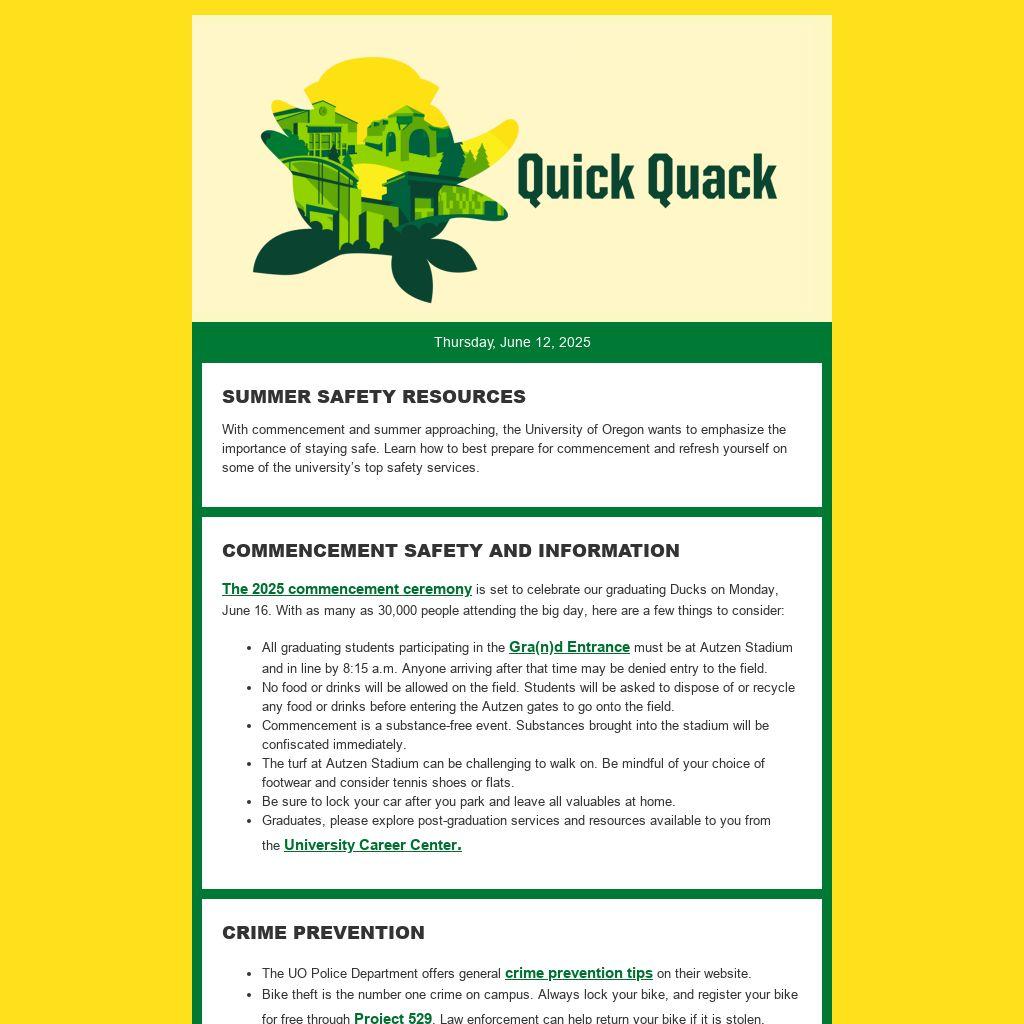 With commencement and summer approaching, the University of Oregon wants to emphasize the importance of staying safe. Learn how to best prepare for commencement and refresh yourself on some of the university’s top safety services.