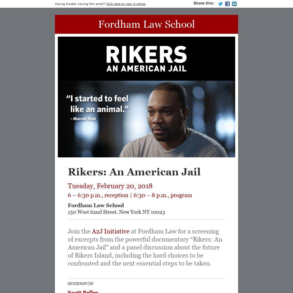 Join the A2J Initiative at Fordham Law for a screening of excerpts from the powerful documentary “Rikers: An American Jail” and a panel discussion about the future of Rikers Island, including the hard choices to be confronted and the next essential steps to be taken.