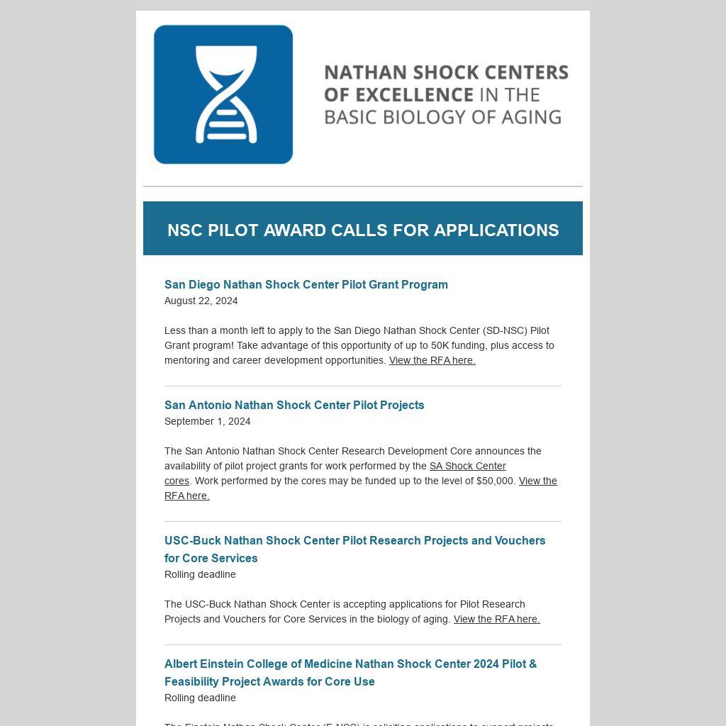 Less than a month left to apply to the San Diego Nathan Shock Center (SD-NSC) Pilot Grant program! Take advantage of this opportunity of up to 50K funding, plus access to mentoring and career development opportunities. View the RFA here.