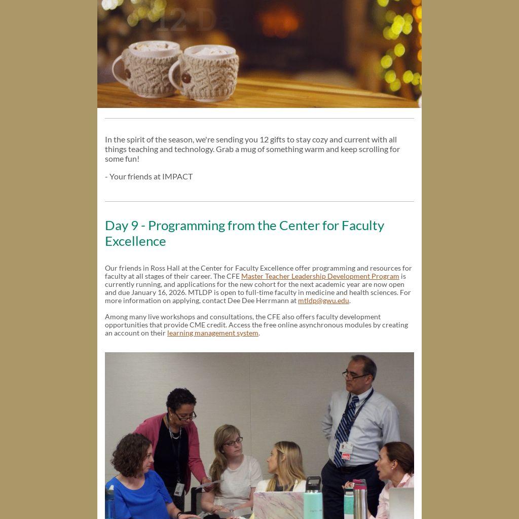 Our friends in Ross Hall at the Center for Faculty Excellence offer programming and resources for faculty at all stages of their career. The CFE Master Teacher Leadership Development Program is currently running, and applications for the new cohort for the next academic year are now open and due January 16, 2026. MTLDP is open to full-time faculty in medicine and health sciences. For more information on applying, contact Dee Dee Herrmann at mtldp@gwu.edu.