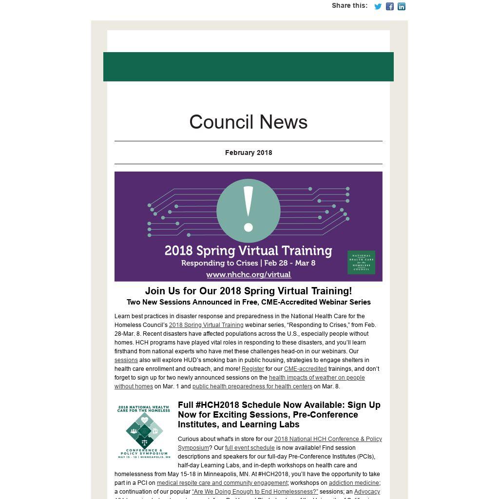 A free Council webinar at 2-3 p.m. CT on Feb. 13 will present an overview of the Health Care for the Homeless (HCH) program and the models of care used by HCH sites nationwide. It can be difficult to meet the complex needs of patients experiencing homelessness in traditional health care settings. Join Alaina Boyer, PhD, Director of Research at the NHCHC, and Eowyn Rieke, MD, MPH, Associate Medical Director of Primary Care at Central City Concern’s Old Town Clinic, for a look at how HCH programs meet the specialized health care needs of these patients, as well as strategies in implementing the HCH model of care in medical practice. Registration is open now.