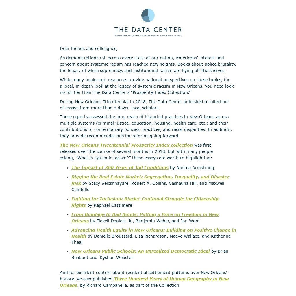 While many books and resources provide national perspectives on these topics, for a local, in-depth look at the legacy of systemic racism in New Orleans, you need look no further than The Data Center’s “Prosperity Index Collection.”