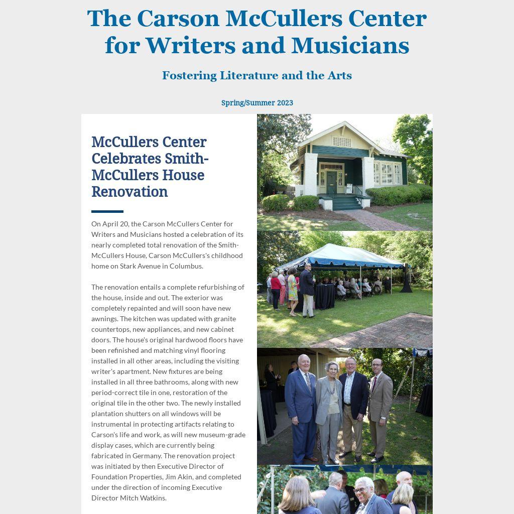 On April 20, the Carson McCullers Center for Writers and Musicians hosted a celebration of its nearly completed total renovation of the Smith-McCullers House, Carson McCullers's childhood home on Stark Avenue in Columbus.