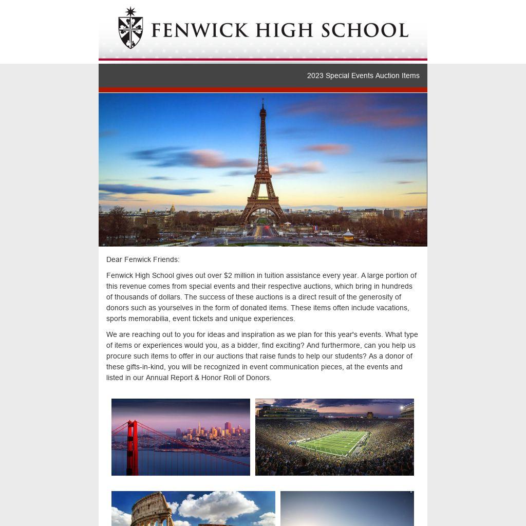 Fenwick High School gives out over $2 million in tuition assistance every year. A large portion of this revenue comes from special events and their respective auctions, which bring in hundreds of thousands of dollars. The success of these auctions is a direct result of the generosity of donors such as yourselves in the form of donated items. These items often include vacations, sports memorabilia, event tickets and unique experiences.