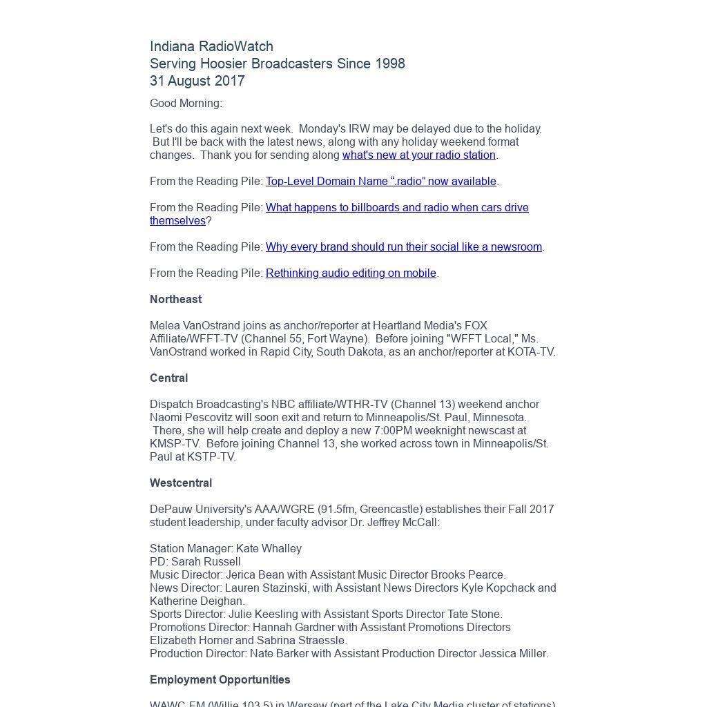 Indiana RadioWatch subscriptions are free. To subscribe, send an e-mail to irw@well.com and we'll add you. After publication, we archive Indiana RadioWatch on the Indiana Radio Archive at http://www.indianaradio.net. Please e-mail us your news stories and employment opportunities.