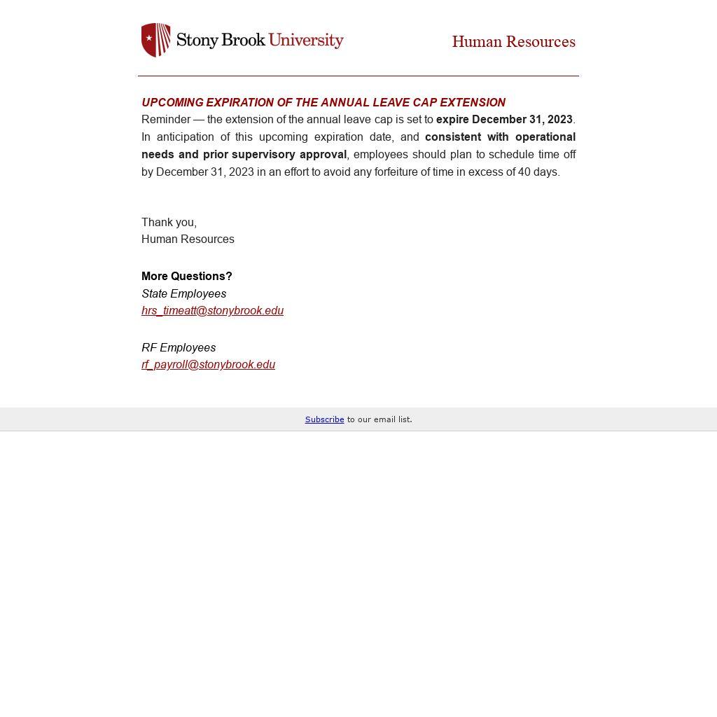 Reminder — the extension of the annual leave cap is set to expire December 31, 2023. In anticipation of this upcoming expiration date, and consistent with operational needs and prior supervisory approval, employees should plan to schedule time off by December 31, 2023 in an effort to avoid any forfeiture of time in excess of 40 days.