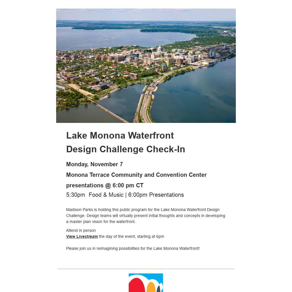 Madison Parks is holding this public program for the Lake Monona Waterfront Design Challenge. Design teams will virtually present initial thoughts and concepts in developing a master plan vision for the waterfront.