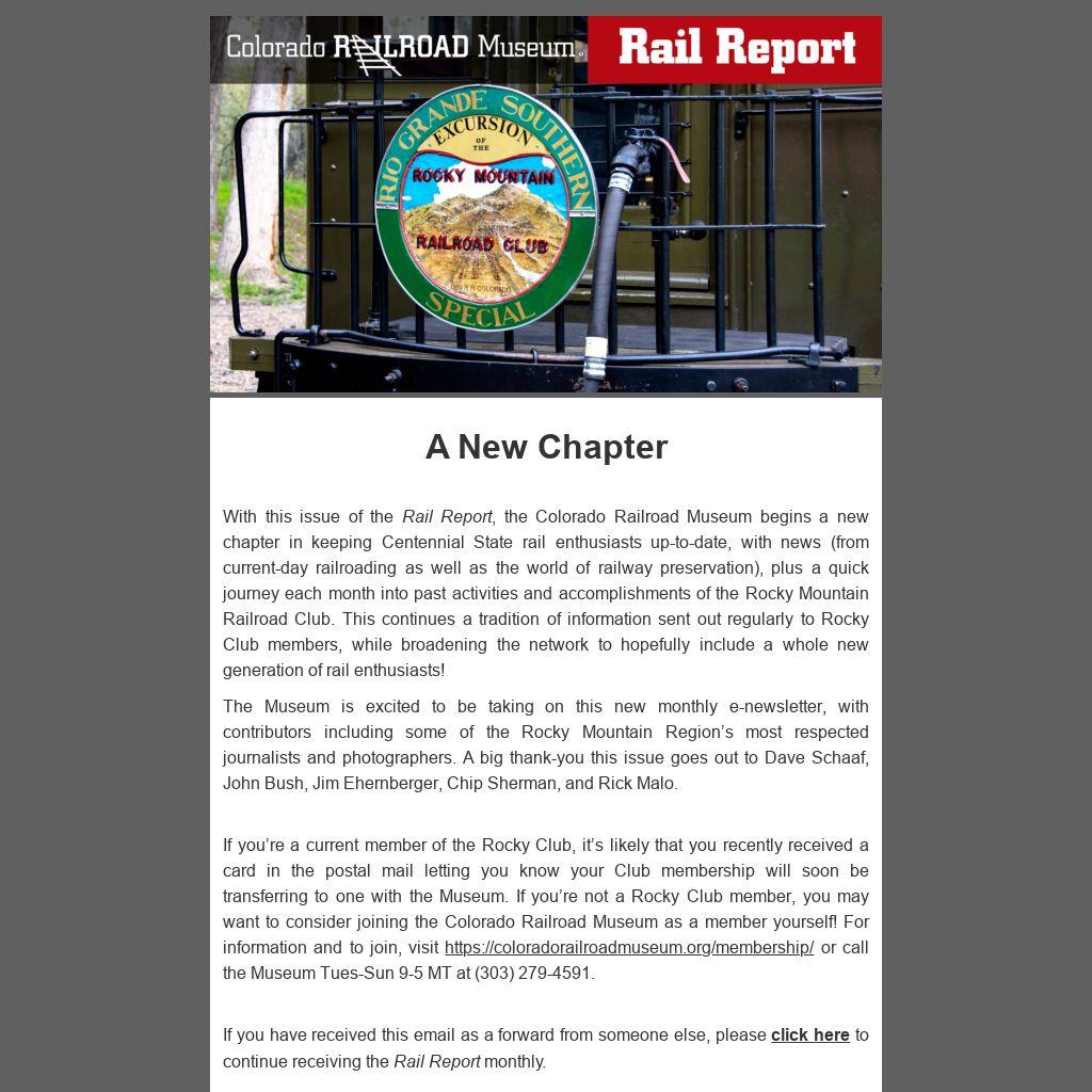 With this issue of the Rail Report, the Colorado Railroad Museum begins a new chapter in keeping Centennial State rail enthusiasts up-to-date, with news (from current-day railroading as well as the world of railway preservation), plus a quick journey each month into past activities and accomplishments of the Rocky Mountain Railroad Club. This continues a tradition of information sent out regularly to Rocky Club members, while broadening the network to hopefully include a whole new generation of rail enthusiasts!