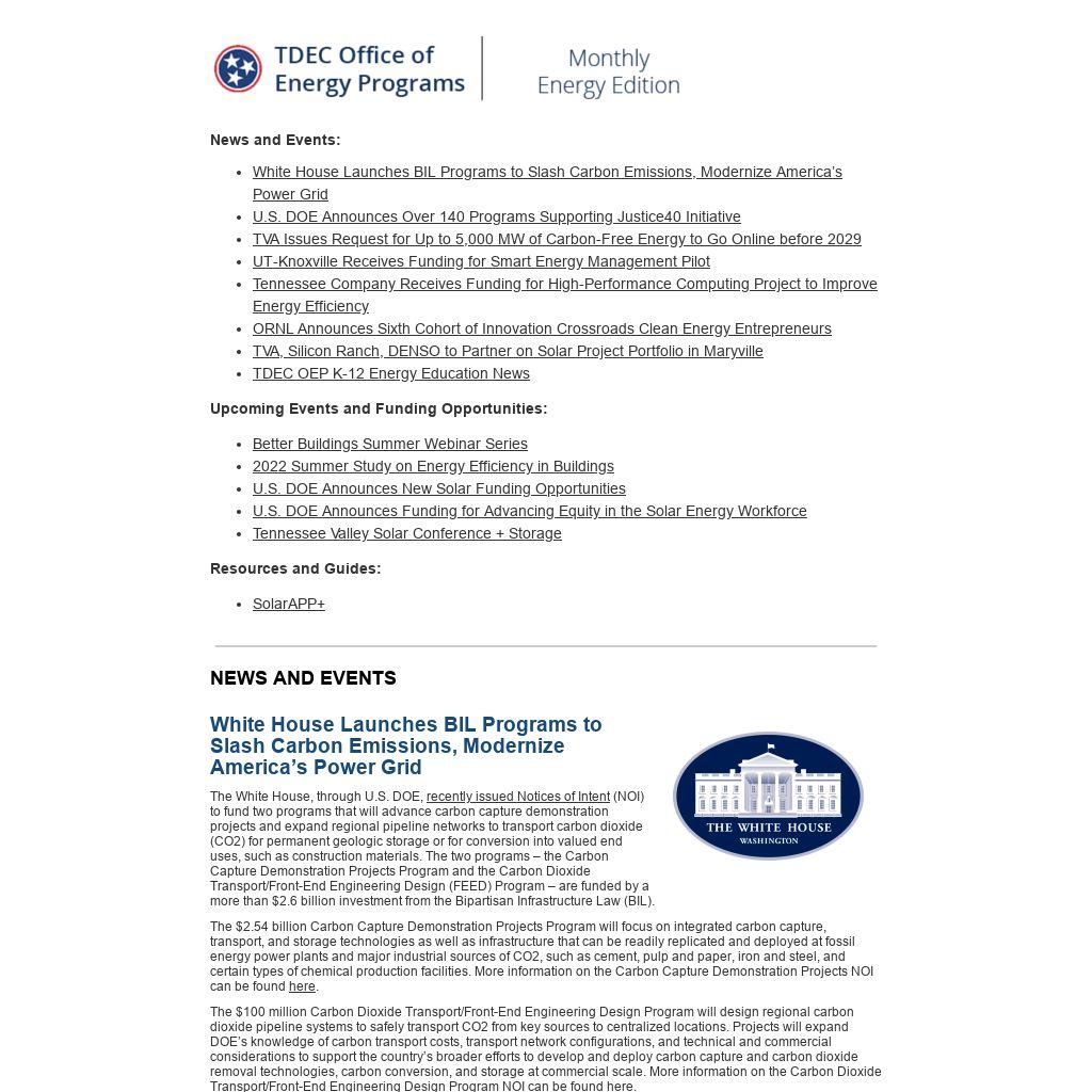 Additionally, the White House and DOE opened the application period for States, Tribal nations, and territories to apply for the $2.3 billion formula grant program designed to strengthen and modernize America’s power grid against wildfires, extreme weather, and other natural disasters exacerbated by the climate crisis. The Preventing Outages and Enhancing the Resilience of the Electric Grid formula grant program will provide $459 million annually (including approximately $7,600,000 to the State of Tennessee) to States and Tribal nations over an anticipated five-year period to improve the resilience of the electric grid against disruptive events. Click here for more information.
