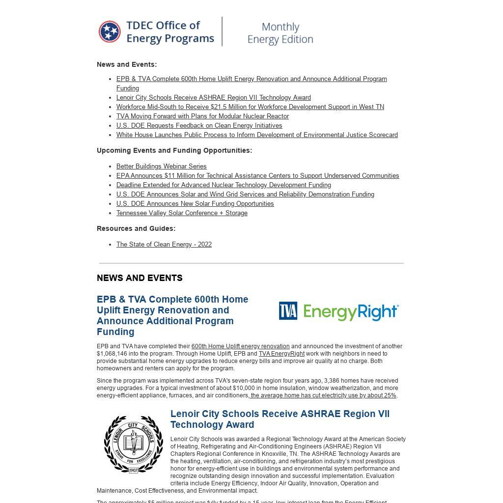 The Clean Energy Business Network recently released the 2022 State of Clean Energy report. The website provides an interactive map depicting state CO2 emission rates for the electricity sector. Explore the map to view state-level data on power sector emissions and key statistics for clean energy deployment, efficiency, and jobs. Also available are top 10 lists for states in various clean energy categories. Read more from the report on Tennessee here.