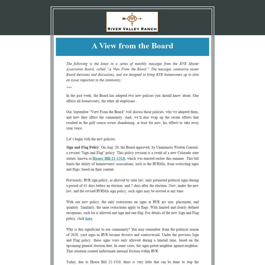 Sign and Flag Policy: On Aug. 29, the Board approved, by Unanimous Written Consent, a revised “Sign and Flag” policy. This policy revision is a result of a new Colorado state statute, known as House Bill 21-1310, which was enacted earlier this summer. This bill limits the ability of homeowners’ associations, such as the RVRMA, from restricting signs and flags, based on their content.