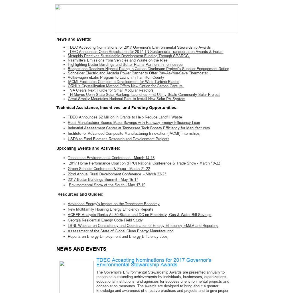 | TDEC Accepting Nominations for 2017 Governor's Environmental Stewardship Awards The Governor’s Environmental Stewardship Awards are presented annually to recognize outstanding achievements by individuals, businesses, organizations, educational institutions, and agencies for successful environmental projects and conservation measures. The awards are designed to bring about a greater knowledge and awareness of effective practices and projects and to give proper recognition to those who make outstanding contributions to the natural resources of their community and the state. A nomination can include information on any achievement by an individual, business, organization, educational institution, or agency that demonstrates successful environmental projects and conservation measures. Award nominations are due by March 31. For more information, click here.