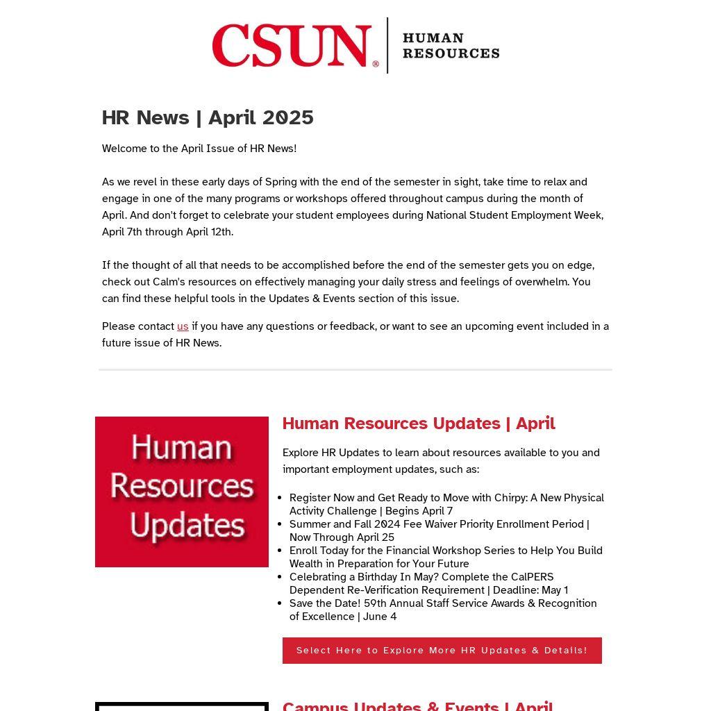 As we revel in these early days of Spring with the end of the semester in sight, take time to relax and engage in one of the many programs or workshops offered throughout campus during the month of April. And don't forget to celebrate your student employees during National Student Employment Week, April 7th through April 12th.