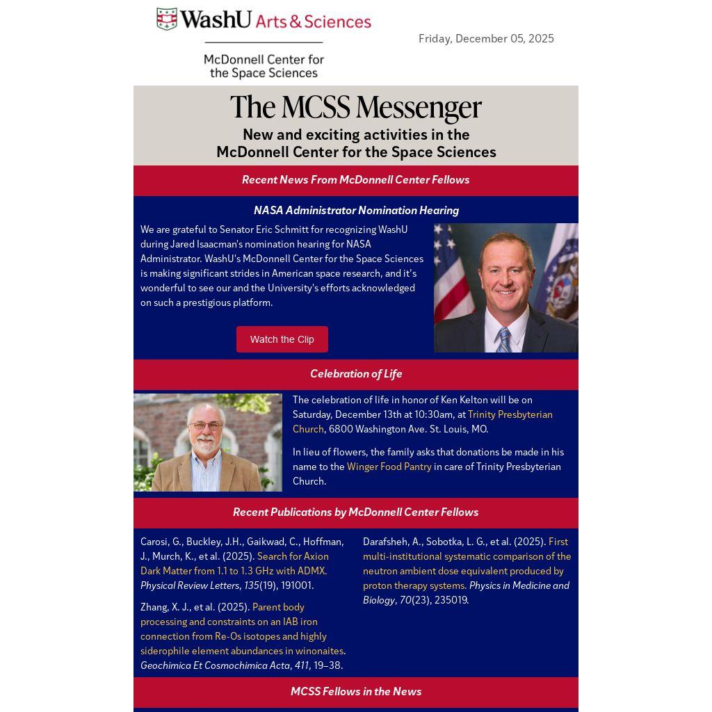 We are grateful to Senator Eric Schmitt for recognizing WashU during Jared Isaacman's nomination hearing for NASA Administrator. WashU's McDonnell Center for the Space Sciences is making significant strides in American space research, and it’s wonderful to see our and the University's efforts acknowledged on such a prestigious platform.