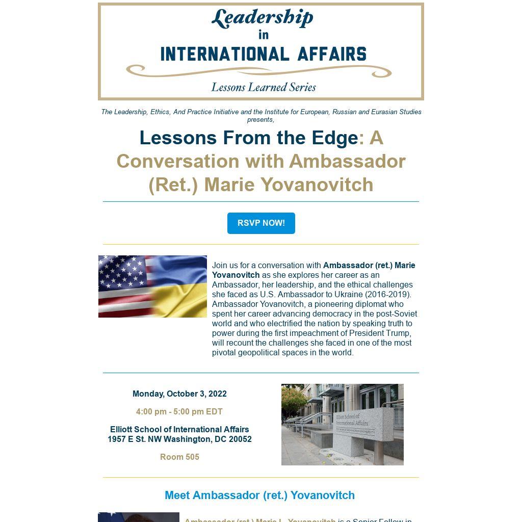 Join us for a conversation with Ambassador (ret.) Marie Yovanovitch as she explores her career as an Ambassador, her leadership, and the ethical challenges she faced as U.S. Ambassador to Ukraine (2016-2019). Ambassador Yovanovitch, a pioneering diplomat who spent her career advancing democracy in the post-Soviet world and who electrified the nation by speaking truth to power during the first impeachment of President Trump, will recount the challenges she faced in one of the most pivotal geopolitical spaces in the world.