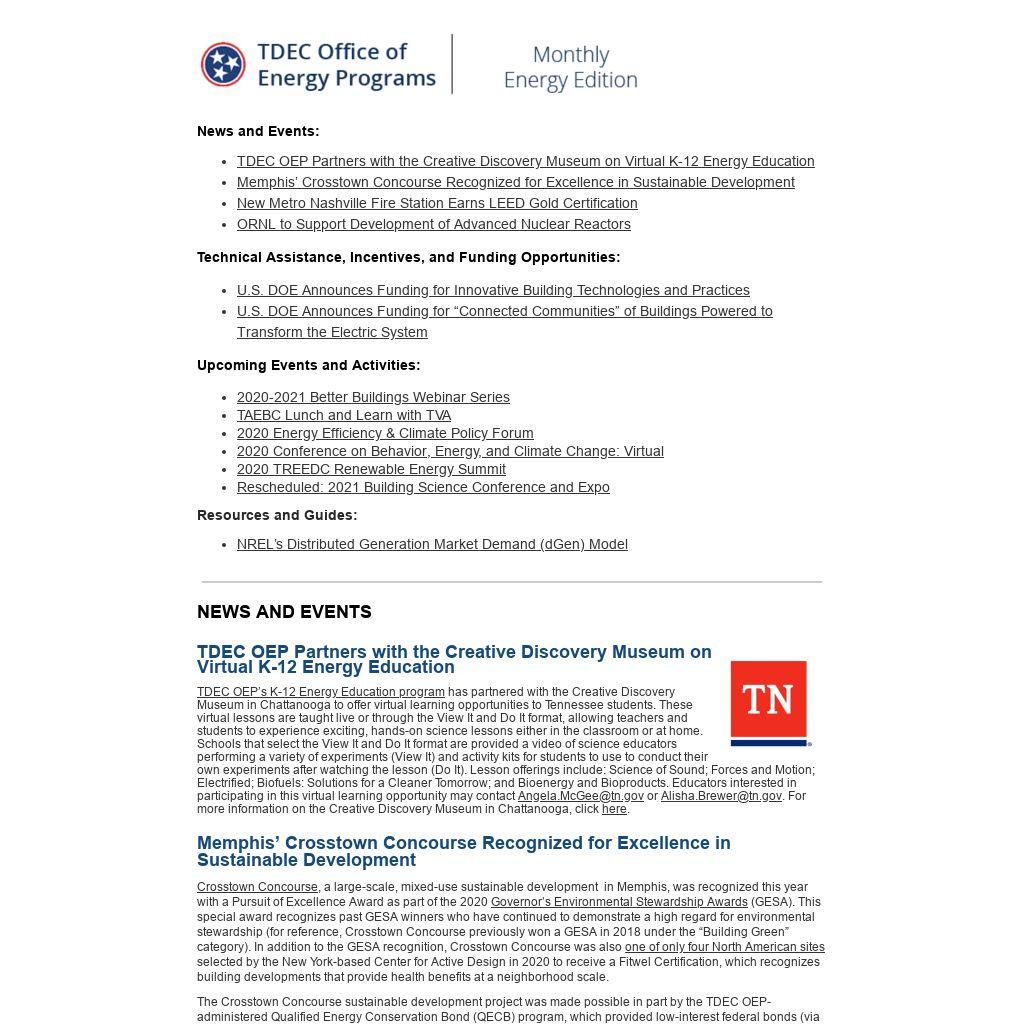 The Tennessee Renewable Energy & Economic Development Council (TREEDC) will hold its annual Renewable Energy Summit on December 11 from 9:30 AM to 2:00 PM Central at Tennessee Tech University in Cookeville. This conference will feature mayoral panels on best practices for economic development, energy efficiency, and innovation in renewable energy during the COVID-19 outbreak. Attendees will hear from local government leaders on the future of renewable energy and from TREEDC members on COVID-19 assistance programs. The conference will include a reception the evening prior to the main event, as well as a ceremony for TREEDC 2020 Champion Award winners. Click here to view the full agenda. Click here to register.