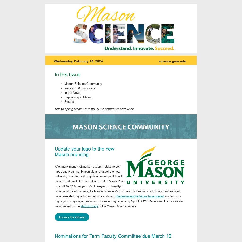 After many months of market research, stakeholder input, and planning, Mason plans to unveil the new university branding and graphic elements, which will include updates to the current logo during Mason Day on April 26, 2024. As part of a three-year, university-wide coordinated process, the Mason Science Marcom team will submit a full list of crowd sourced college-related logos that will require updating. Please review the list we have started and add any logos your program, organization, or center may require by April 1, 2024. Details and the list can also be accessed on the Marcom page of the Mason Science Intranet.