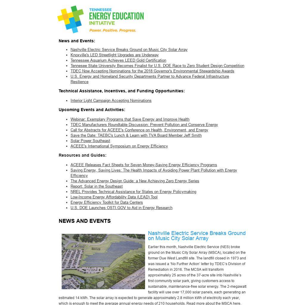 Earlier this month, Nashville Electric Service (NES) broke ground on the Music City Solar Array (MSCA), located on the former Due West Landfill site. The landfill closed in 1973 and was issued a ‘No Further Action’ letter by TDEC’s Division of Remediation in 2016. The MCSA will transform approximately 25 acres of the 37-acre site into Nashville’s first community solar park, giving customers access to sustainable, maintenance-free solar energy. The 2-megawatt facility will use over 17,000 solar panels, each generating an estimated 14 kWh. The solar array is expected to generate approximately 2.8 million kWh of electricity each year, which is enough to meet the average annual energy needs of 210 households. Read more about the MSCA here.
