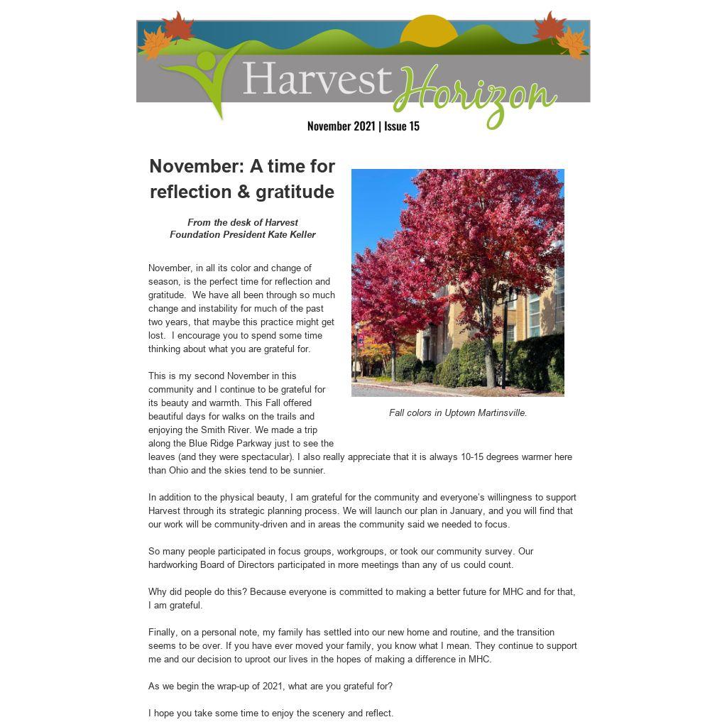 In addition to the physical beauty, I am grateful for the community and everyone’s willingness to support Harvest through its strategic planning process. We will launch our plan in January, and you will find that our work will be community-driven and in areas the community said we needed to focus.