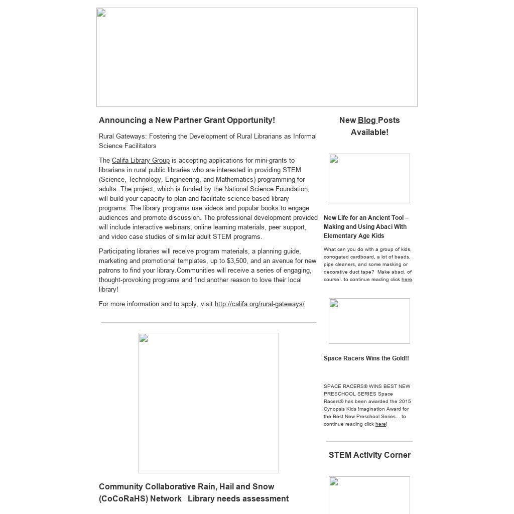 Califa Library Group is accepting applications for mini-grants to librarians in rural public libraries who are interested in providing STEM (Science, Technology, Engineering, and Mathematics) programming for adults. The project, which is funded by the National Science Foundation, will build your capacity to plan and facilitate science-based library programs. The library programs use videos and popular books to engage audiences and promote discussion. The professional development provided will include interactive webinars, online learning materials, peer support, and video case studies of similar adult STEM programs.