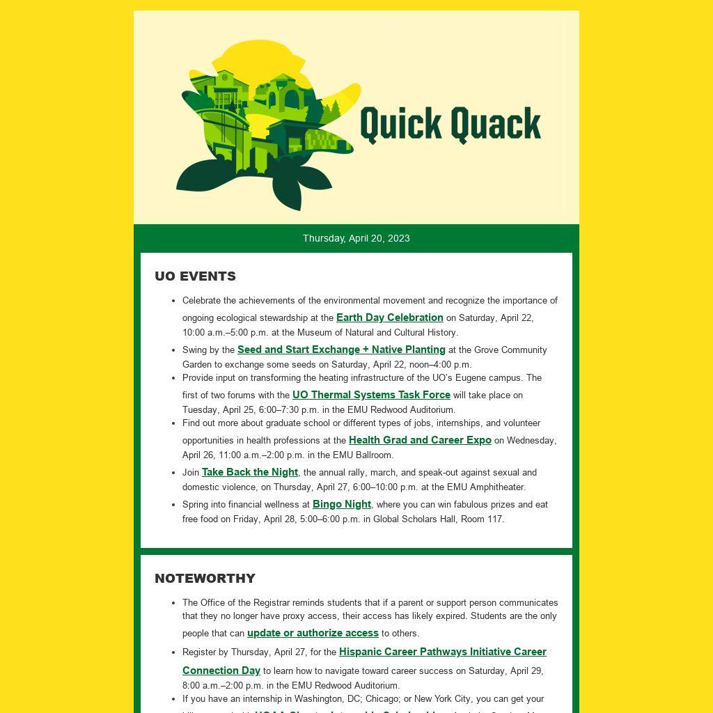 - Provide input on transforming the heating infrastructure of the UO’s Eugene campus. The first of two forums with the UO Thermal Systems Task Force will take place on Tuesday, April 25, 6:00–7:30 p.m. in the EMU Redwood Auditorium.