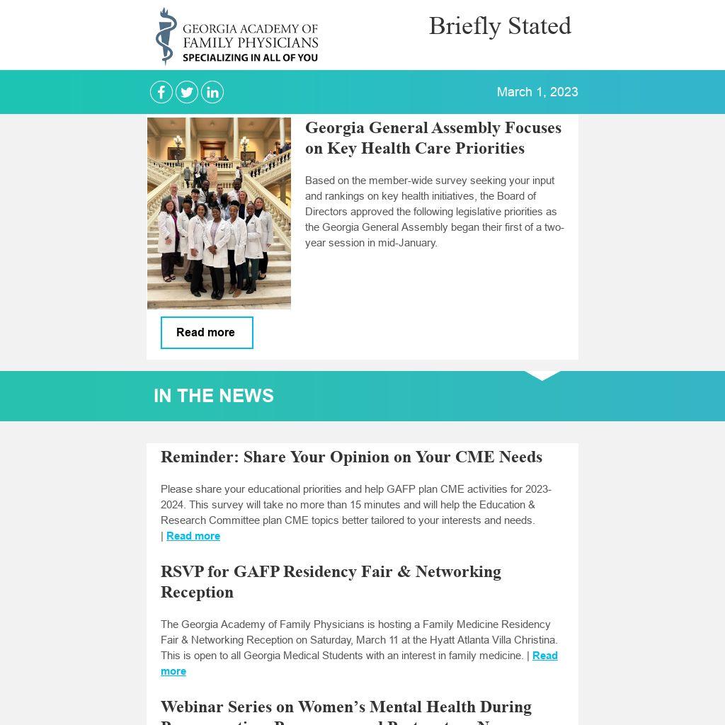 Copyright 2023 Georgia Academy of Family Physicians To ensure that e-mails from GAFP are delivered to your inbox, please add gafp@gafp.org to your address book or list of approved senders.