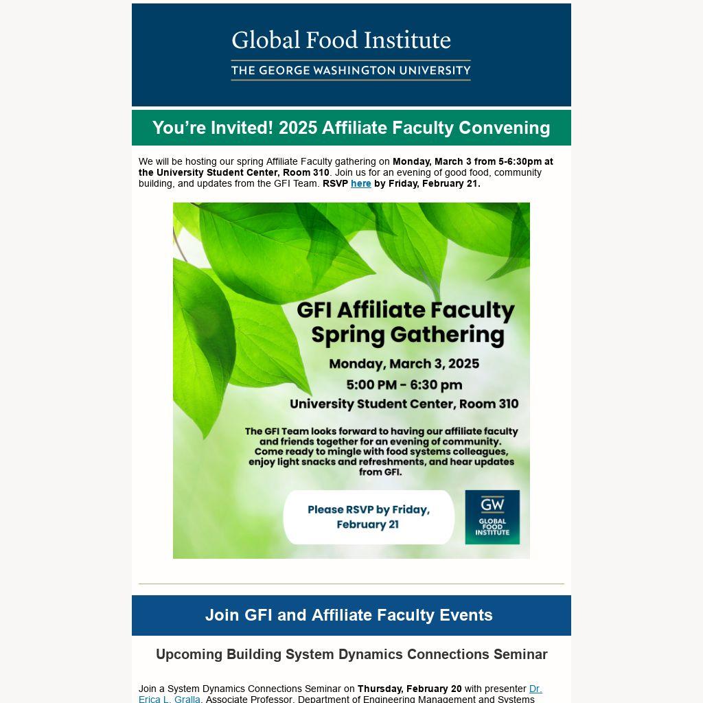 We will be hosting our spring Affiliate Faculty gathering on Monday, March 3 from 5-6:30pm at the University Student Center, Room 310. Join us for an evening of good food, community building, and updates from the GFI Team. RSVP here by Friday, February 21.
