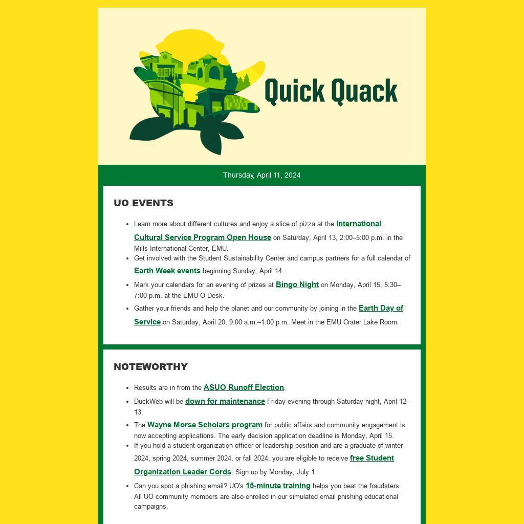 - DuckWeb will be down for maintenance Friday evening through Saturday night, April 12–13.