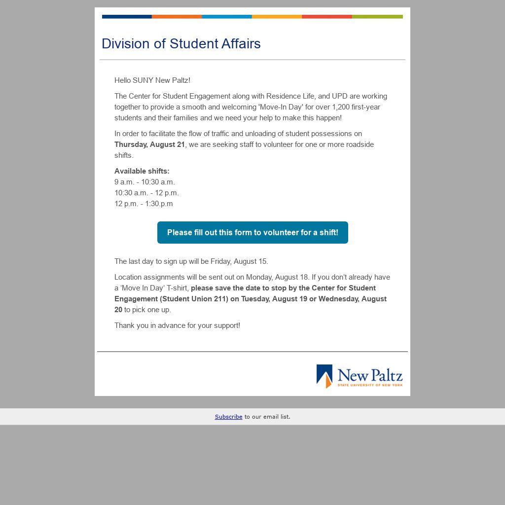 The Center for Student Engagement along with Residence Life, and UPD are working together to provide a smooth and welcoming 'Move-In Day' for over 1,200 first-year students and their families and we need your help to make this happen!