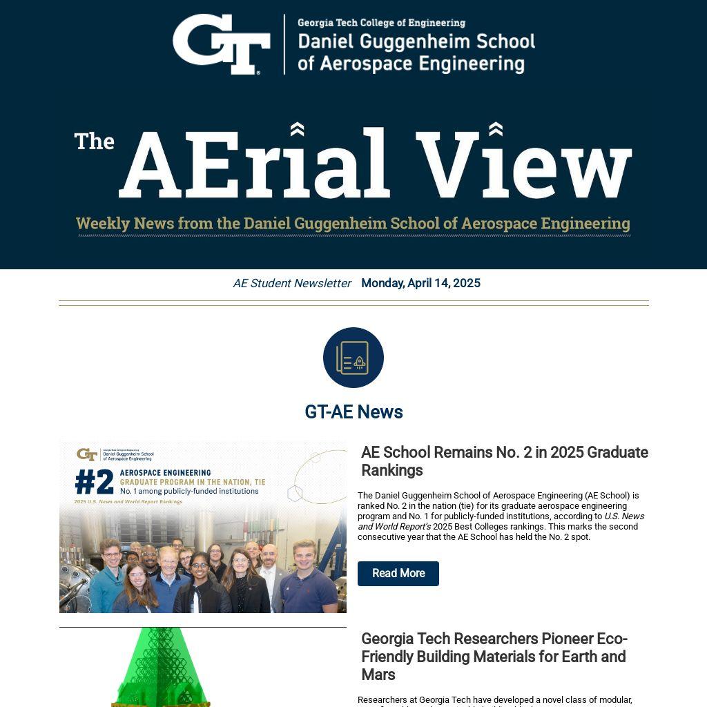 The Daniel Guggenheim School of Aerospace Engineering (AE School) is ranked No. 2 in the nation (tie) for its graduate aerospace engineering program and No. 1 for publicly-funded institutions, according to U.S. News and World Report’s 2025 Best Colleges rankings. This marks the second consecutive year that the AE School has held the No. 2 spot.
