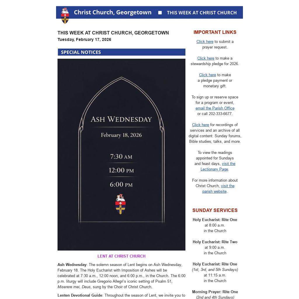 THIS WEEK AT CHRIST CHURCH, GEORGETOWN Tuesday, February 17, 2026