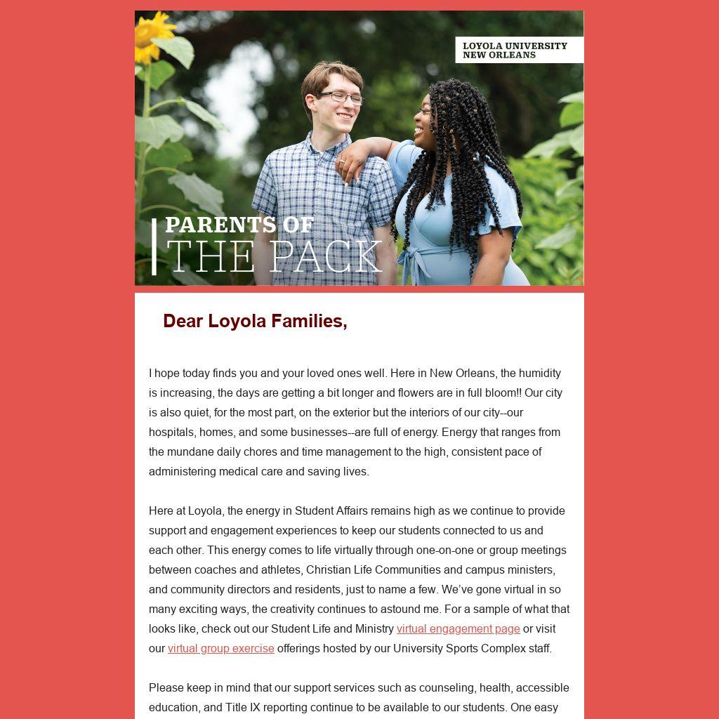 Here at Loyola, the energy in Student Affairs remains high as we continue to provide support and engagement experiences to keep our students connected to us and each other. This energy comes to life virtually through one-on-one or group meetings between coaches and athletes, Christian Life Communities and campus ministers, and community directors and residents, just to name a few. We’ve gone virtual in so many exciting ways, the creativity continues to astound me. For a sample of what that looks like, check out our Student Life and Ministry