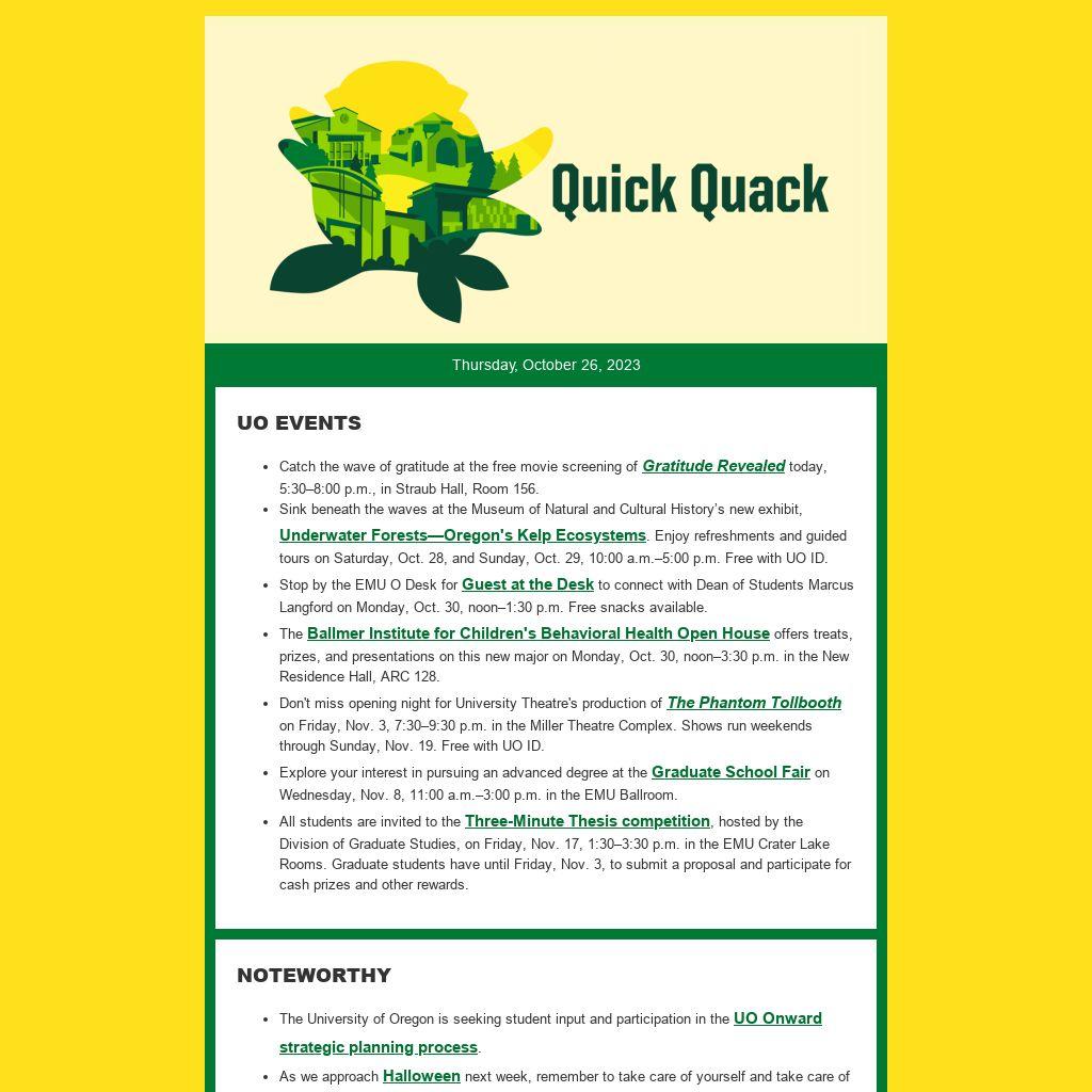 - Catch the wave of gratitude at the free movie screening of Gratitude Revealed today, 5:30–8:00 p.m., in Straub Hall, Room 156.