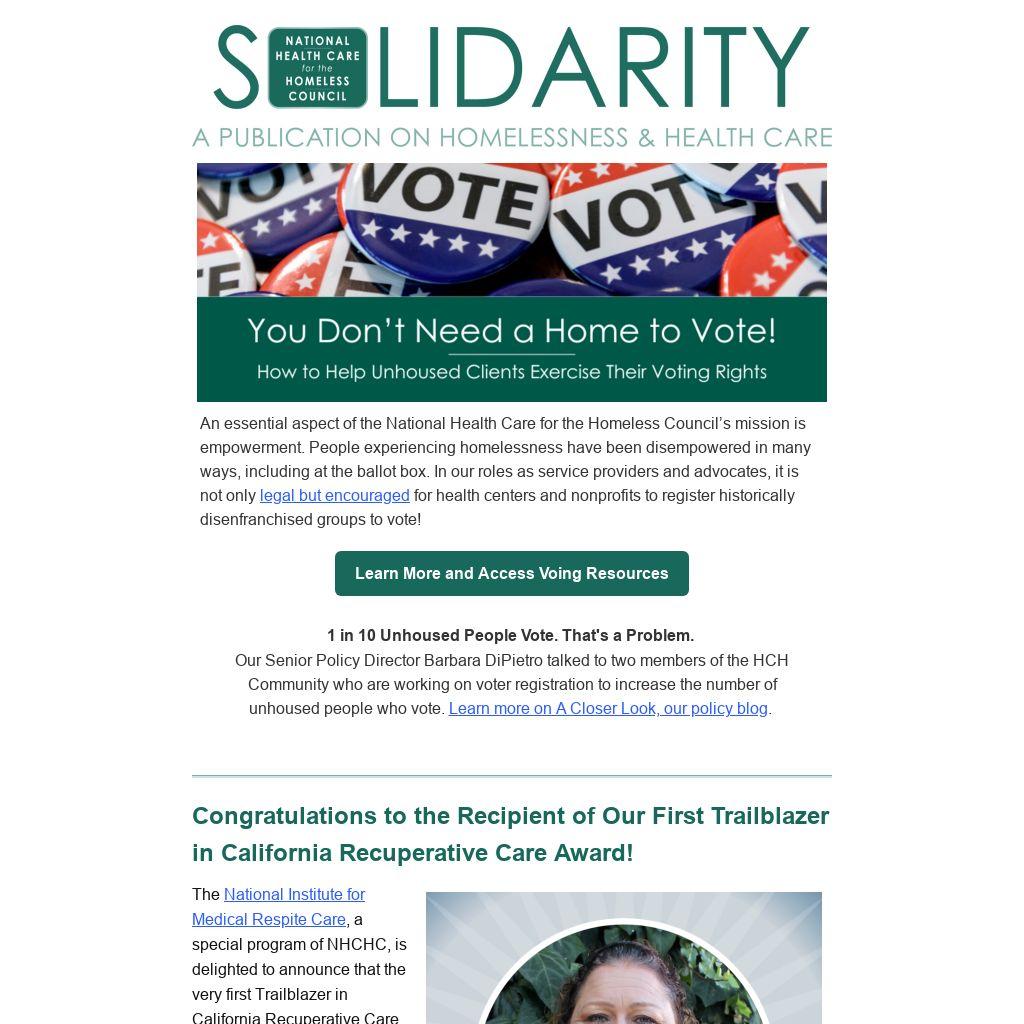 | An essential aspect of the National Health Care for the Homeless Council’s mission is empowerment. People experiencing homelessness have been disempowered in many ways, including at the ballot box. In our roles as service providers and advocates, it is not only legal but encouraged for health centers and nonprofits to register historically disenfranchised groups to vote!