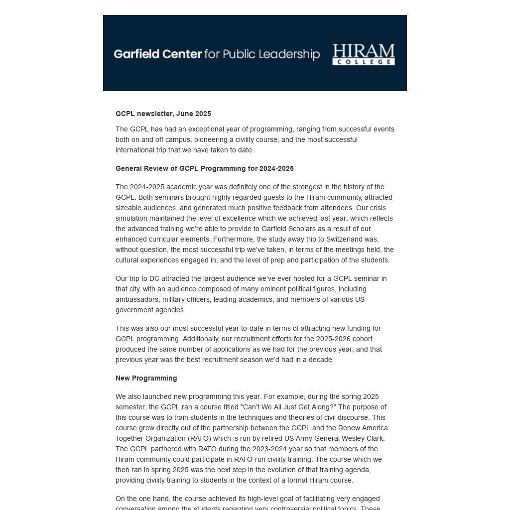 The 2024-2025 academic year was definitely one of the strongest in the history of the GCPL. Both seminars brought highly regarded guests to the Hiram community, attracted sizeable audiences, and generated much positive feedback from attendees. Our crisis simulation maintained the level of excellence which we achieved last year, which reflects the advanced training we’re able to provide to Garfield Scholars as a result of our enhanced curricular elements. Furthermore, the study away trip to Switzerland was, without question, the most successful trip we’ve taken, in terms of the meetings held, the cultural experiences engaged in, and the level of prep and participation of the students.