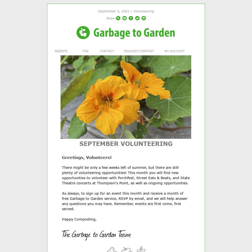 As always, to sign up for an event this month and receive a month of free Garbage to Garden service, RSVP by email, and we will help answer any questions you may have. Remember, events are first come, first served.